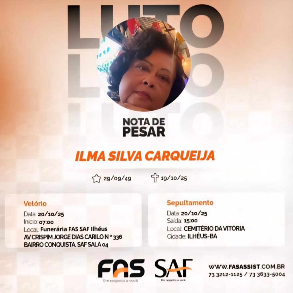 - Local: Funerária FAS SAF Ilhéus, situada na Avenida Crispim Jorge Dias Carilo, nº 336, Bairro Conquista, Sala 04.