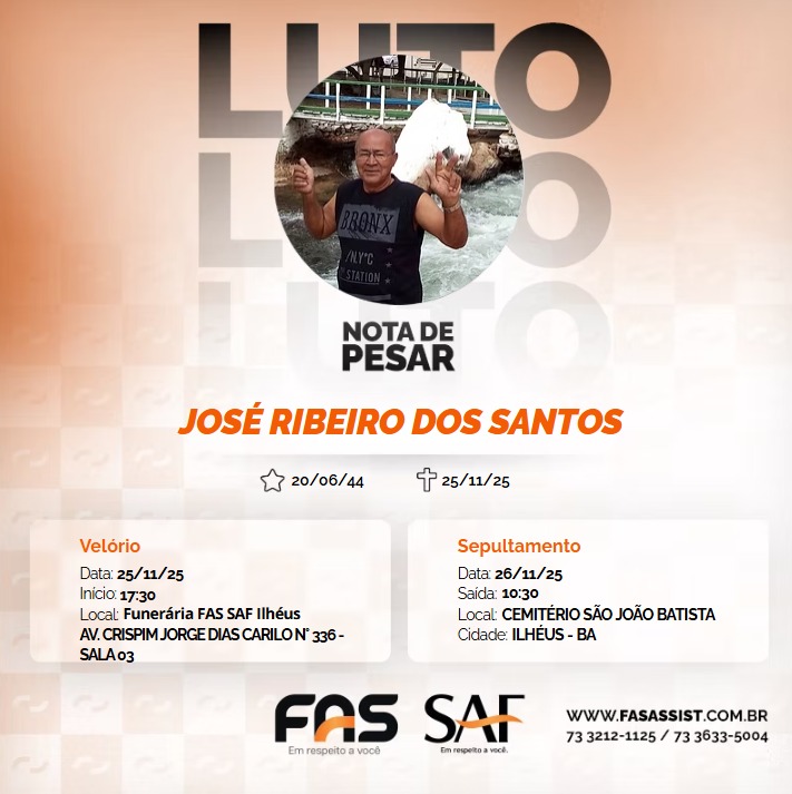 O Sindicato dos Bancários de Ilhéus, por meio de seu presidente, Rodrigo Cardoso, lamenta o falecimento de José Ribeiro Dos Santos, ocorrido na última terça-feira, 25 de novembro de 2025.